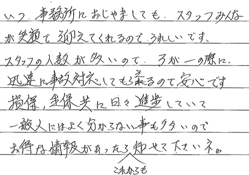 HOME > お客様の声 > 万が一の際に迅速に事故対応してもらえる(岩手県大船渡市 新沼様)